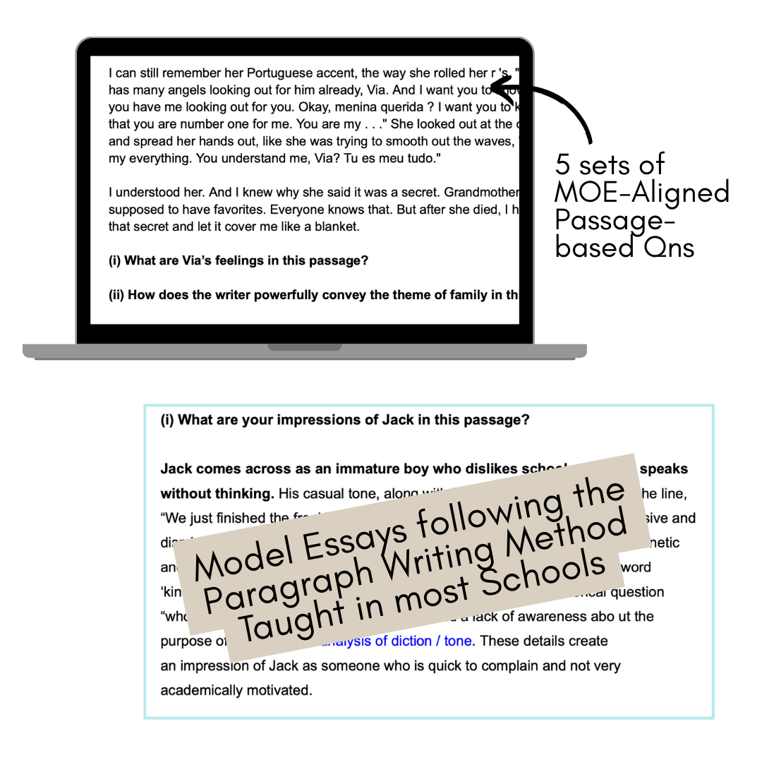 You cannot find any model essays or practice questions for your childâs set text. Even if you find something online, it's not designed for the MOE Singapore syllabus.